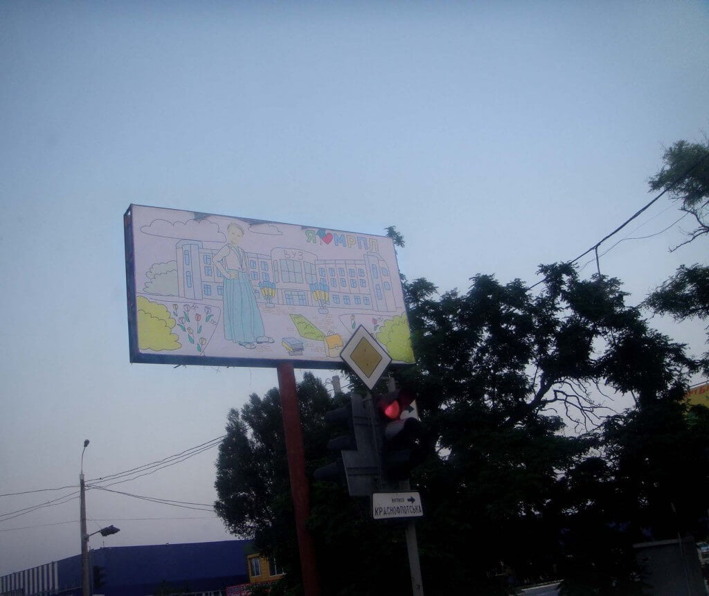 Danielle: It’s a very difficult question, because when we came to Mariupol, surely we’ve read some newspapers and news, we did know what was happening. So we came there with a certain perspective and a certain impression of the city. And my first impression was like: “Oh, wow. It is not so much affected by the war.” Because actually I expected it to be much worse. But now my second impression when I came I realized that it was actually very innocent because I expected much more. You can feel the energy. You can see soldiers and the army everywhere, it starts already by leaving the city as every time you have to go through the checkpoint, several checkpoints. This is something I can imagine has influence all the time, because it is not like “I just gonna go and visit my sister in Donetsk”. It is not as easy as this. One lady was telling us: “My only dream is to go and visit my family that lives in Donetsk.” That’s the thing, this is how it influences [the people – edit.]. Everybody knows somebody living in the conflict area or who had to go out of the area. Everybody is influenced. From the visual point of view it’s a little bit more hidden, especially for us that we cannot read what is said there. But on the billboards there are a lot of pictures of soldiers with Ukrainian symbol and children in their arms. This is a certain narration. Especially for German people this is something uncommon to see the Ukrainian flag everywhere. This was something that we said it’s a statement. It’s a statement to put the Ukrainian flag around the city or to paint things in blue-and-yellow. This is the point, the statement that you are giving in the time of conflict and especially for Mariupol.