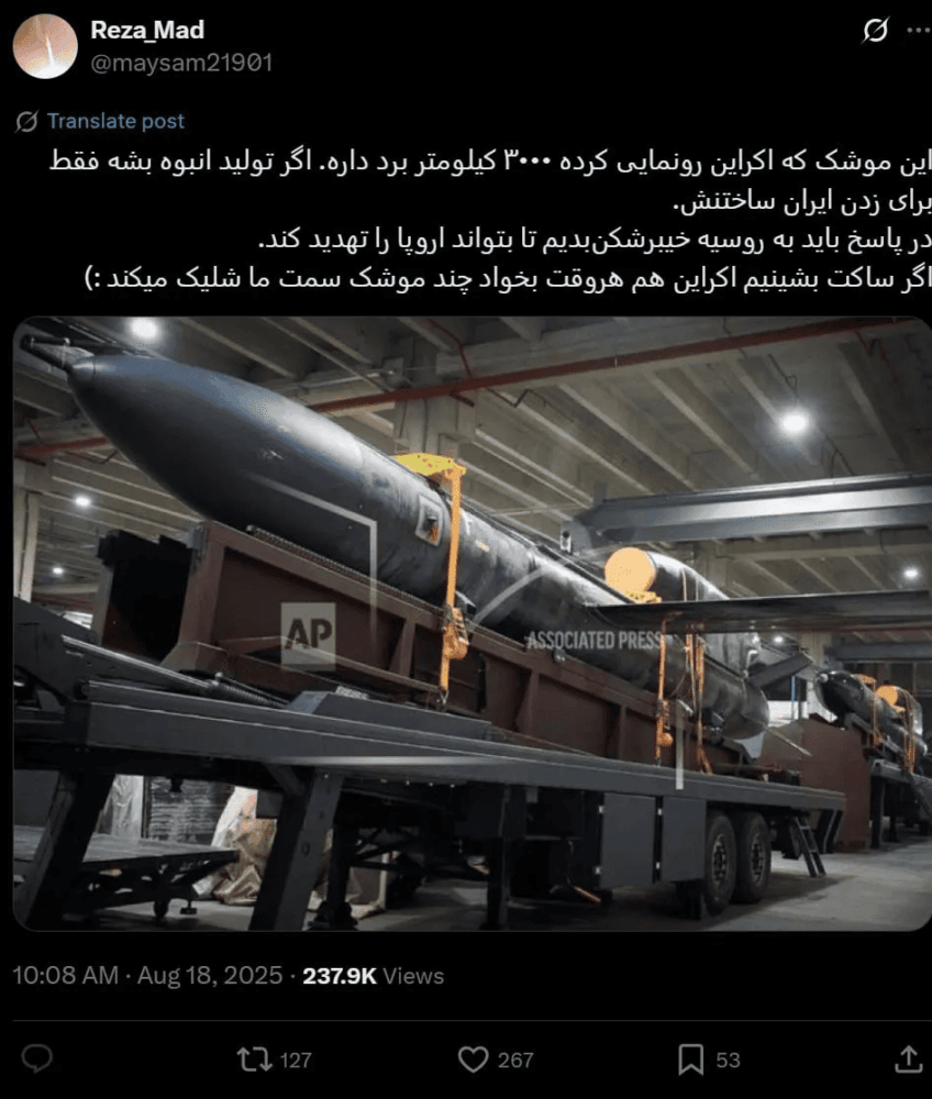 The journalist, who personally visited one of the missile production facilities on August 14, also reported that the missiles have a range of 3,000 kilometers and a warhead weighing over 1,000 kilograms.