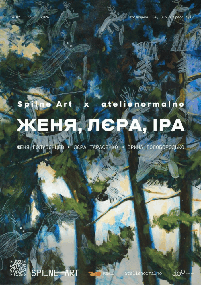 The exhibition features collaborative works by the artists of Atelienormalno: Valeriia Tarasenko’s painted landscapes are improvisationally complemented by graphic drawings from Yevhen Holubentsev and Iryna Holoborodko.