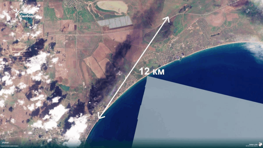 As reported by Radio Liberty, a satellite image dated October 6 shows smoke from the oil depot fire stretching for 12 kilometers.