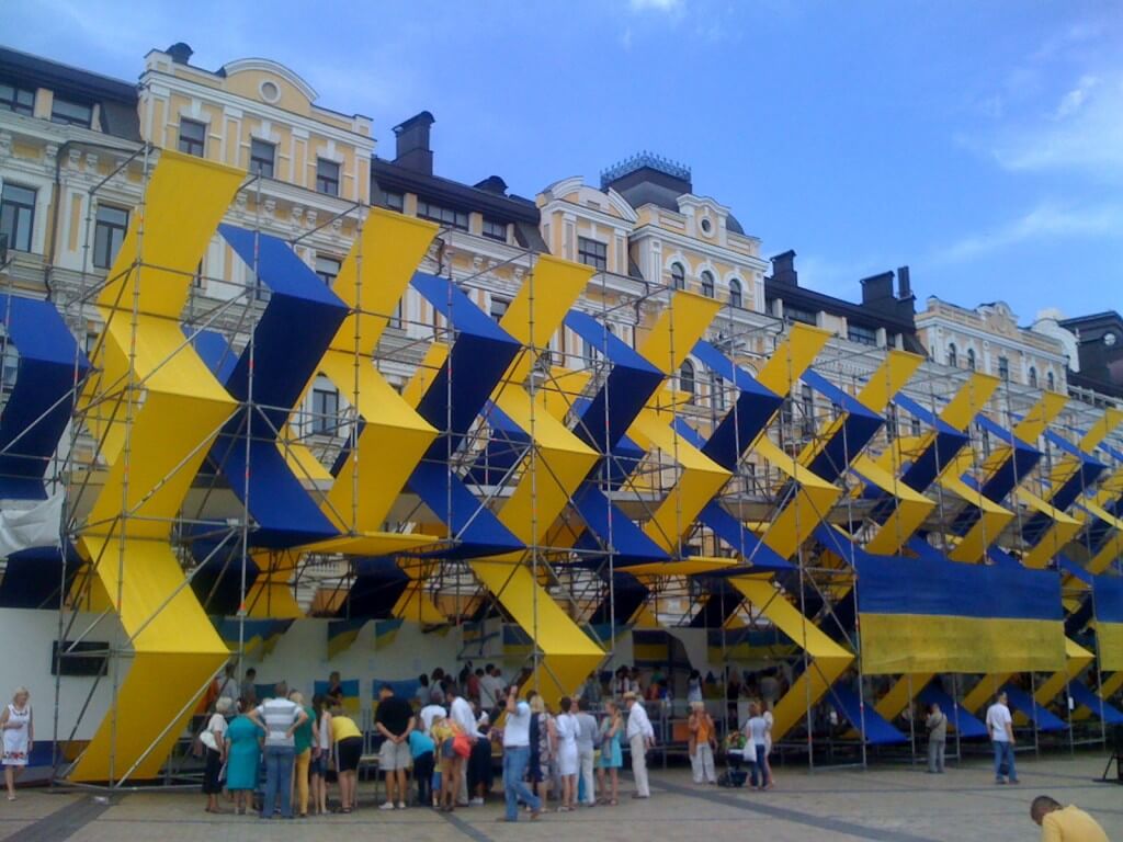 Exhibition of Ukrainian flags that the servicemen were carrying in combat opened on Sofiyska square in Kyiv on 23 August – the Day of Ukraine’s National Flag. The flags are showcased inside a pop-up construction installed on the square and decorated with yellow-and-blue cloth.