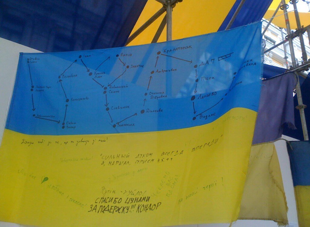 Most of the flags at the exhibition are brought from the combat zone and belong to a particular unit of Ukrainian Armed Forces or the National Guard. Many are covered with hand-writing and pictures indicating units’ deployment places with dates, servicemen’s call signs, words of encouragement and support. Alongside the combat flags there are ones taken from militant captivity while risking the life, flags that parted in Crimea events and the Revolution of Dignity.