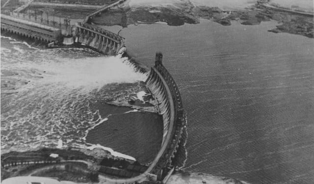 Blowing up Dniproges by Soviet troops in the evening of August 18, 1941. Stalin himself gave the decision to blow up the Dnipro GESu dam and blamed the Germans (on the right photo below).