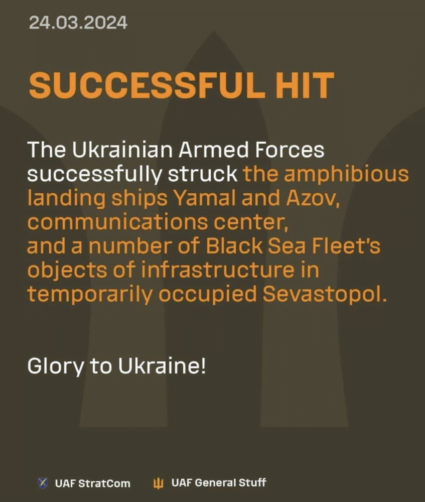 Ukraine’s defense forces successfully hit large amphibious russian ships “Yamal” and “Azov” in Sevastopol occupied Crimea last nigh. This is 7 out 13 russian landing ships of the Russian Navy. Russia has two ships left each in the Black Sea, Baltic and Northern fleets.