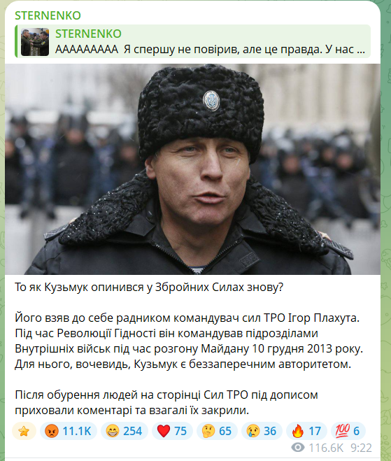 “So how did Kuzmuk end up in the Armed Forces again? He was taken on as an adviser by the commander of the TDF, Ihor Plakhuta. During the Revolution of Dignity, he commanded units of the Internal Troops during the dispersal of Maidan on December 10, 2013. For him, Kuzmuk is apparently an unquestionable authority,” the volunteer wrote.