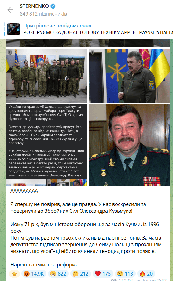 “I didn’t believe it at first, but it’s true. Oleksandr Kuzmuk has been resurrected and returned to the Armed Forces! He is 71 years old, served as defence minister back in Kuchma’s time, since 1996. Later, he was an MP for three convocations from the Party of Regions. During his time in parliament, he signed an appeal to the Polish Sejm asking to recognize that Ukrainians supposedly committed genocide against Poles. Finally, army reform,” sarcastically remarked public figure, volunteer, and blogger Serhiy Sternenko.