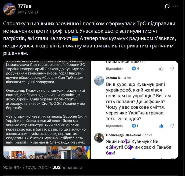 “At first, the Territorial Defence Forces were criminally and hastily formed from civilians and sent, untrained, against a professional army. As a result, thousands of patriots who stood to defend us died. And now Kuzmuk has appeared there as an adviser — I wouldn’t be surprised if he had influence from the very beginning and contributed to those tragic decisions,” one post stated.