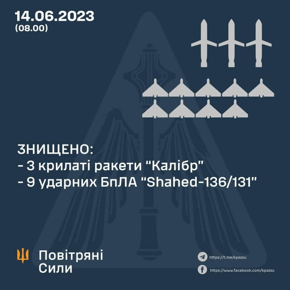 On the night of June 14, 2023, the russian invaders launched another missile attack on military and infrastructure facilities of Ukraine with air and sea-based cruise missiles of Kalibr type, as well as Iranian made shahed kamikaze attack drones.