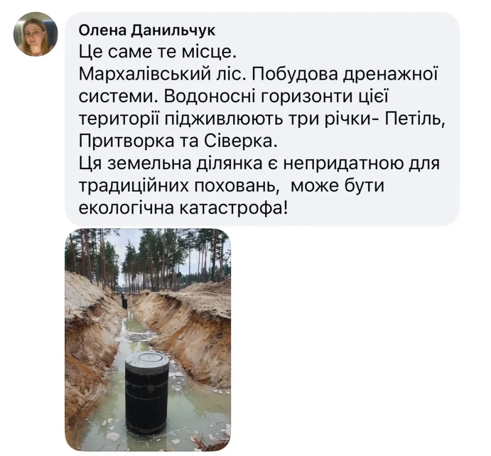 The reason is simple. The central executive authorities at all levels have completely disregarded public opinion regarding the construction of the National Military Memorial Cemetery in the forest between the villages of Hatne and Markhalivka near Kyiv.