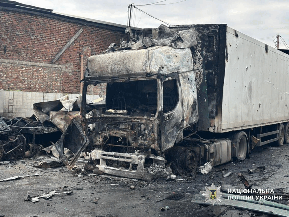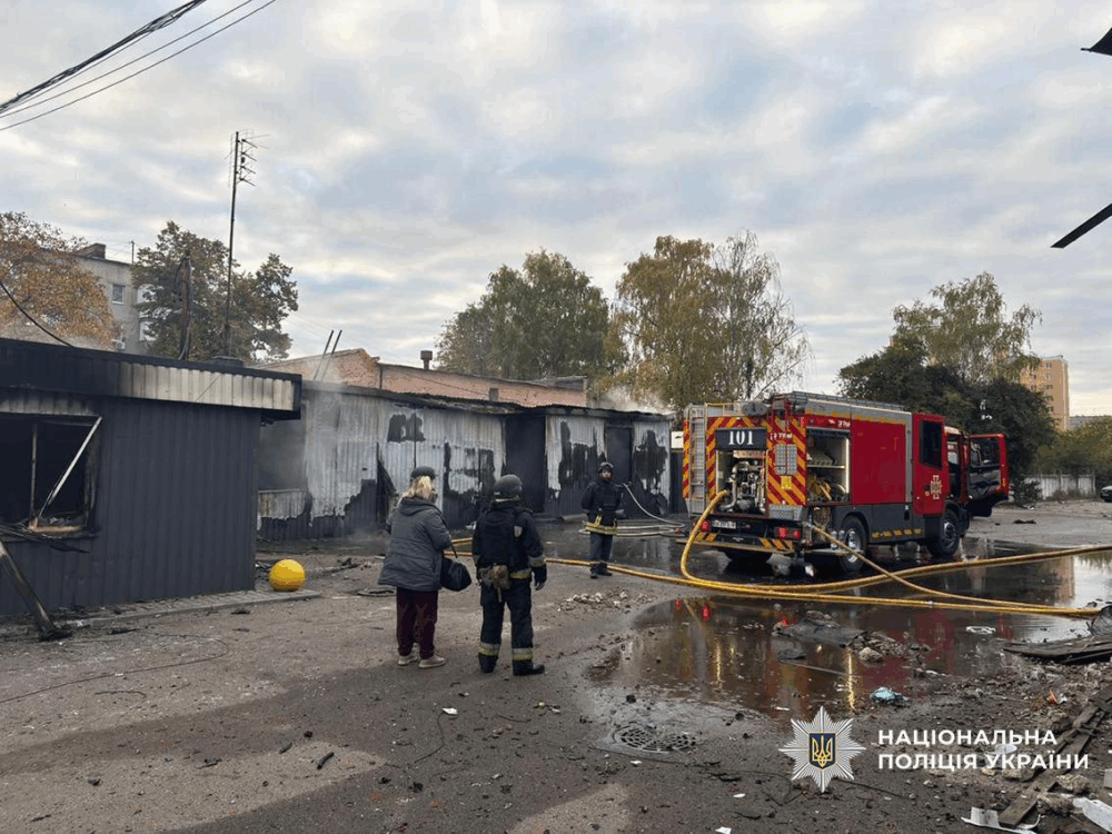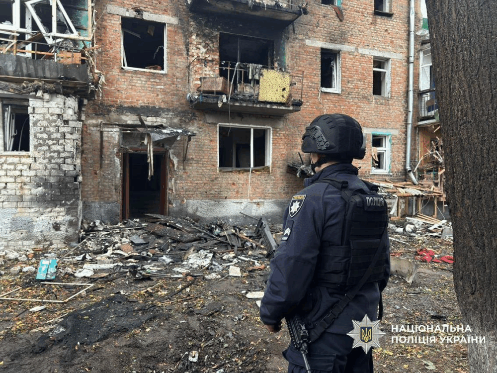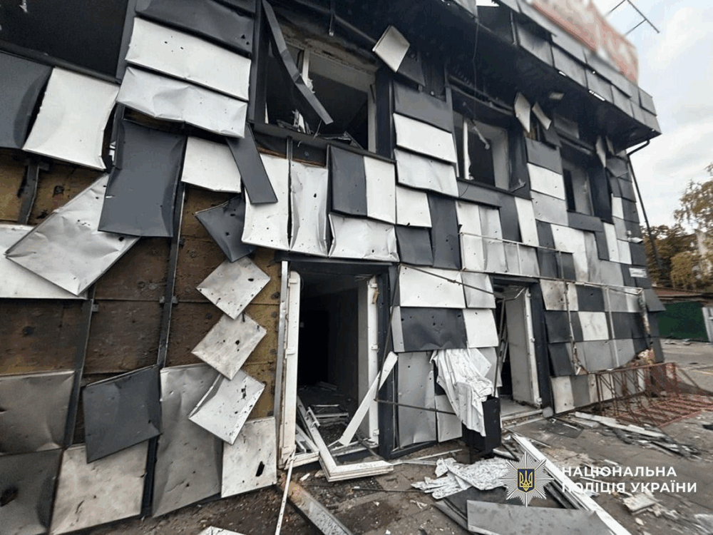 The attack damaged civilian infrastructure, multi-story residential buildings, shops, and vehicles. Fires broke out. One local resident was reported injured, according to the National Police.