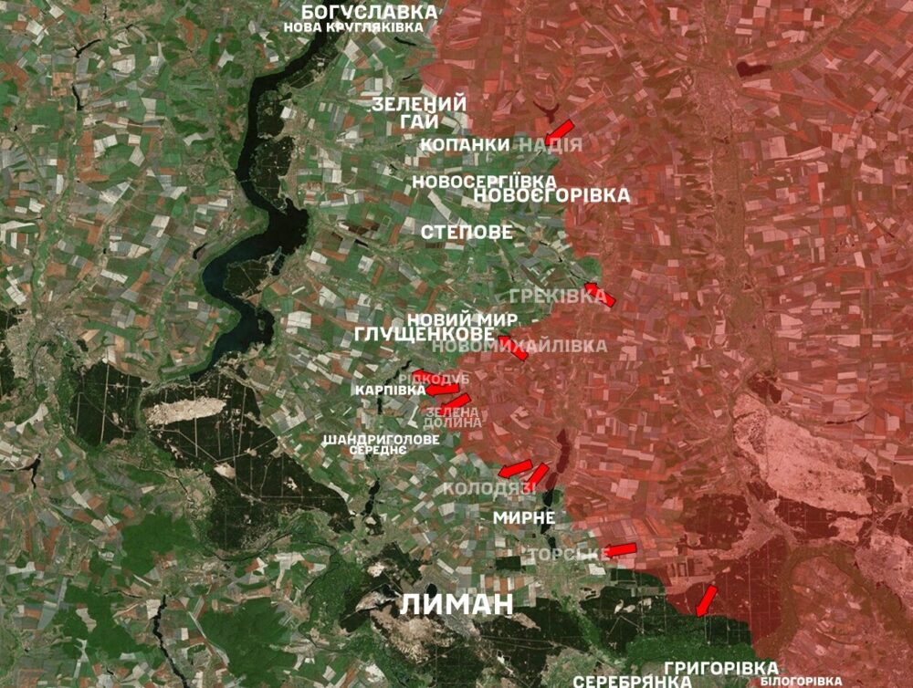 Lyman Direction: Ukrainian defenders thwarted 24 enemy attacks near Novyi Myr, Novoyehorivka, Hrekivka, Karpivka, Kolodiazi, Zelena Dolyna, Torske, and toward Shandryholove and Serebrianka. Four clashes are ongoing.