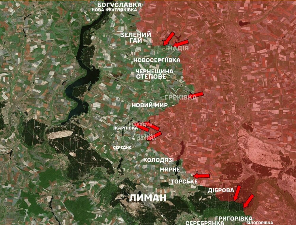 In the Lyman direction, Russian invaders attacked the positions of the Defense Forces 33 times near the settlements of Novoyegorivka, Hrekivka, Karpivka, Zelena Dolyna, Novyi Mir, Ridkodub, Myrne, Torske, and Hryhorivka.
