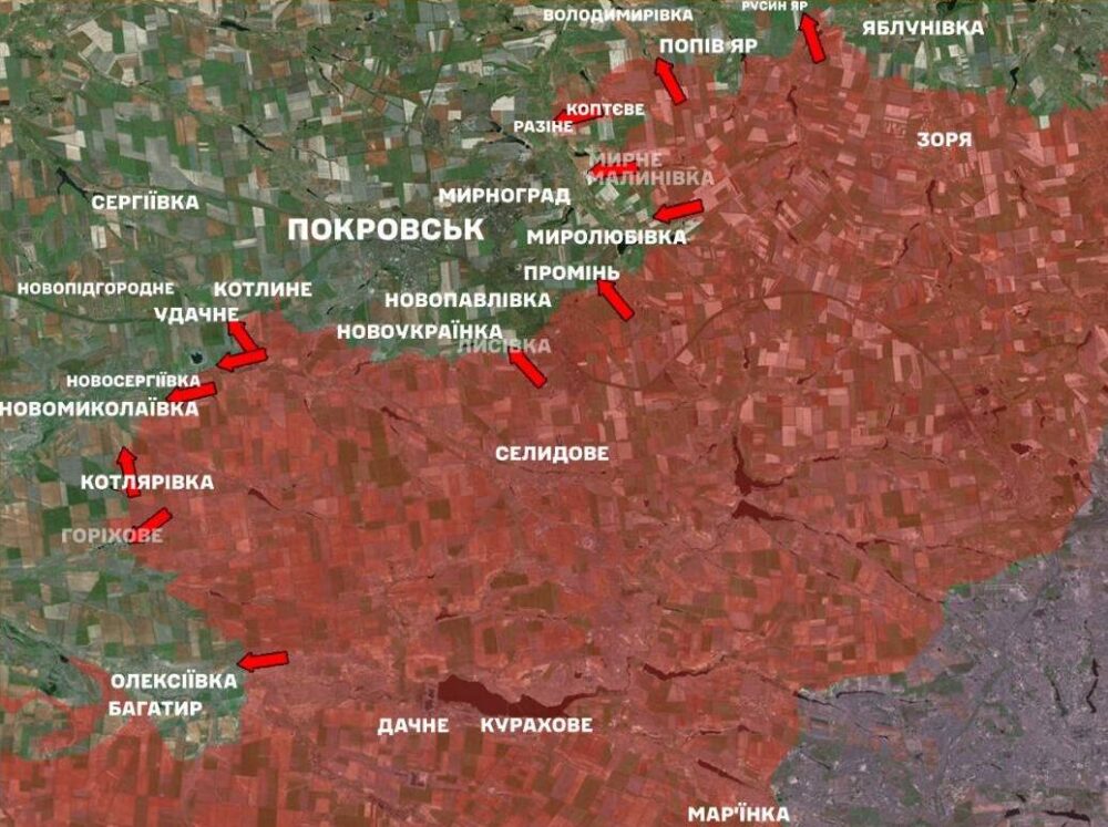 In the Pokrovsk direction, enemy units attempted 30 times to break through our defenses near Rusyn Yar, Razine, Novotoretske, Myrne, Promin, Novosergiivka, Volodymyrivka, Myroliubivka, Myrnohrad, Lysivka, Udachne, Muravka, Novopavlivka, Orikhove, and Oleksiivka. One combat clash is still ongoing.