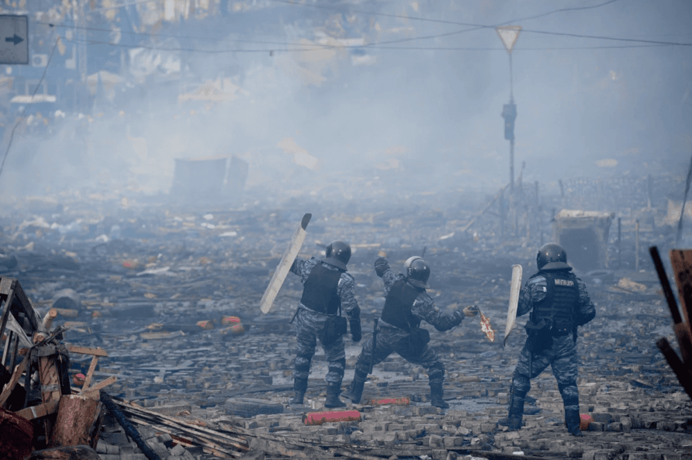 The protesters cannot get anywhere near the parliament. Around 11 a.m., Berkut is deployed, using, among other things, Russian “humanitarian aid”: flashbangs and tear gas grenades more powerful than the Ukrainian ones. Protesters are mercilessly beaten, and dozens are injured, including from the explosions of Russian grenades.