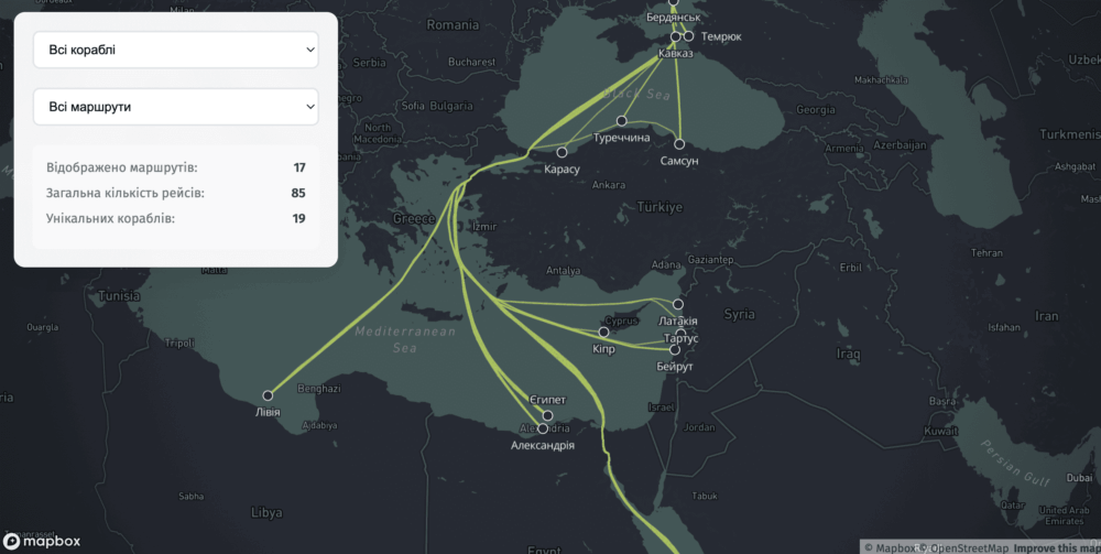 The map shows schematic routes of Russian vessels that transported grain from Berdyansk. Use the filters to search for specific ships or routes. Click on a route line to get detailed information about the voyage, or click on a port to see all voyages that passed through it.