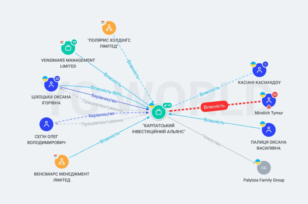 According to media reports, structures of the Palytsia family may also be connected to companies previously owned by Timur Mindich – co-founder of the Kvartal-95 studio and business partner of Ihor Kolomoyskyi. In particular, Mindich owned PJSC “Tsentrelevatormlinbud,” which holds real estate in Kyiv. Currently, the company’s beneficiary is listed as Oksana Palytsia. He was also a co-founder of Carpathian Investment Alliance LLC, now owned by Oksana Palytsia and Oksana Tsikhotska.