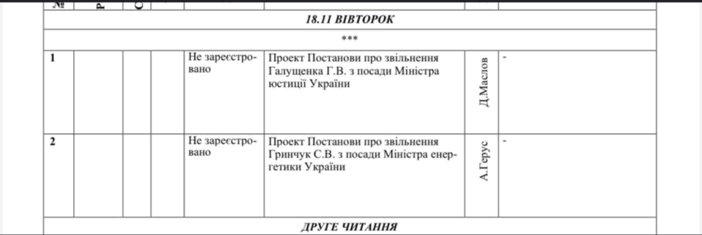 The Verkhovna Rada is set to vote on the dismissal of Justice Minister Herman Halushchenko and Energy Minister Svitlana Hrynchuk at its next session next week on Tuesday, November 18.
