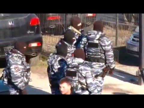 Journalists are rudely pushed out of polling station during the Crimean referendum conducted by Russia after armed seizure and occupation of Ukrainian peninsula